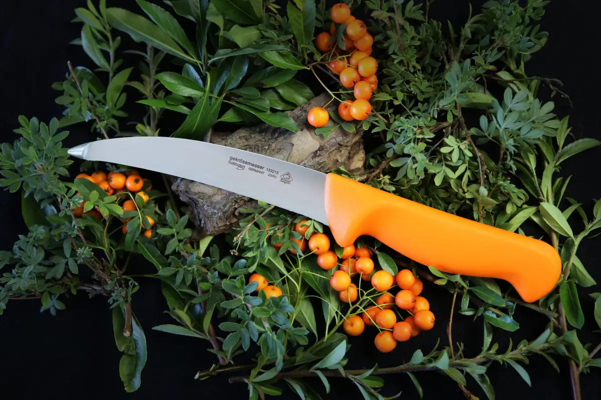 - Gebogene oder bauchige Klingenform für sauberes Abtrennen von Haut und Gewebe
