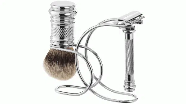 This beautiful set comes with everything you need to get started: In addition to the Merkur razor 38C in a chrome-plated version including a razor blade, you also get a shaving brush made of real silver tip. You whip your shaving foam in the enclosed pan. Then you arrange everything clearly in the supplied stand.