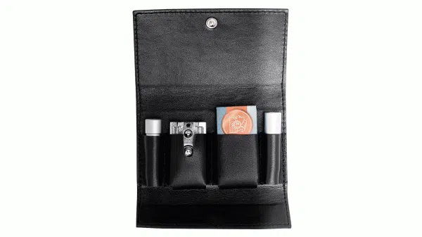 The Merkur Shaving Set 46C: Would you like to look chic while traveling? Then you should take a look at the Merkur 46C Shaving Set. The Model 46 is a small, lightweight safety razor that can be easily disassembled for quick transport or storage. Simply stow away in the elegant, space-saving leather case. Here you will also find a pack of razor blades for your trip!