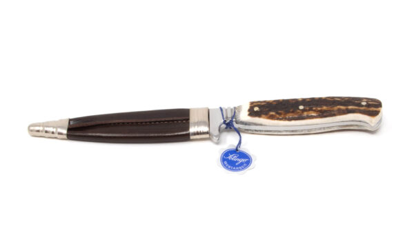Dieser handgearbeitete Jagdnicker der Solinger Traditionsfirma Hartkopf, besticht durch seine attraktiven und schön strukturierten Hirschhorn-Schalen. Die wahlweise 11 cm lange Klinge besteht aus rostfreien Molybdänstahl 4116. Dieses Messer hilft dem Jäger, Groß- und Kleinwild problemlos aufzubrechen, dieses hochwertige Messer wird in Solingen in sorgfältiger Handarbeit gefertigt. Im Lieferumfang ist eine braune Steckscheide enthalten..