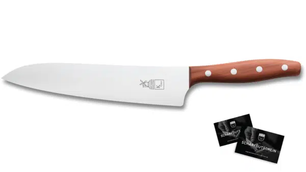 Mit dem Kauf von diesem Messer schenken wir Ihnen eine Gutscheinkarte für ein professionelles Nachschärfen gratis dazu. Auch die besten Messer verlieren mit der Zeit, trotz optimaler Anwendung und Lagerung, an Schärfe. Ist der Prozess zu weit fortgeschritten, reicht das Schärfen durch einen Wetzstahl nicht mehr aus. Mit unserem Schärfgutschein geben wir Ihnen die Möglichkeit, Ihre Messer wieder in neuem Glanz erstrahlen zu lassen. Ihre Messer werden dann bei der Wasserkraft Manufaktur im Solinger Wipperkotten nachgeschärft. Alle weiteren Informationen finden Sie weiterhin auf der Gutscheinkarte und auf unserem Schleifservice.
